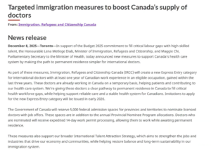 · 针对医生的新通道:IRCC已宣布将于2026年初启动全新的“有加拿大工作经验的医生”类别。该类别要求申请人在过去三年内,在加拿大特定的医生职位上有至少一年的全职工作经验。